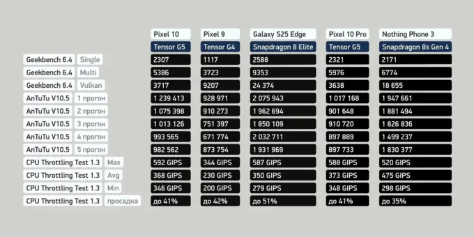 Выводы — вроде хочется похвалить, но экран, производительность и камера разочаровывают. Есть куча других смартфонов из Китая, которые по большинству показателей уделают Pixel 10. Обновляться с Pixel 9 нет никакого смысла, с Pixel 5-6 — можно подумать.