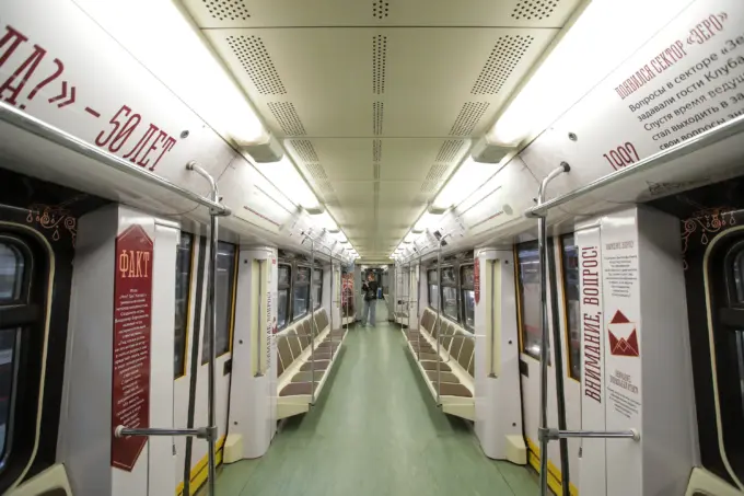 Московское метро в честь 50-летия передачи «Что? Где? Когда?» запустило уникальный поезд. Его оформили в фирменном стиле телевикторины, а станции метрополитена объявляют голосом ведущего.