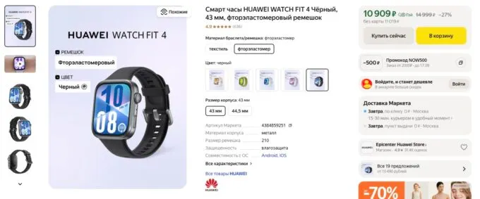 Прямо сейчас на Яндекс Маркете свежие часы Huawei Watch Fit 4 можно урвать за 10 909 рублей. А с кэшбеком некоторых банков вы сэкономите ещё пару сотен рублей.