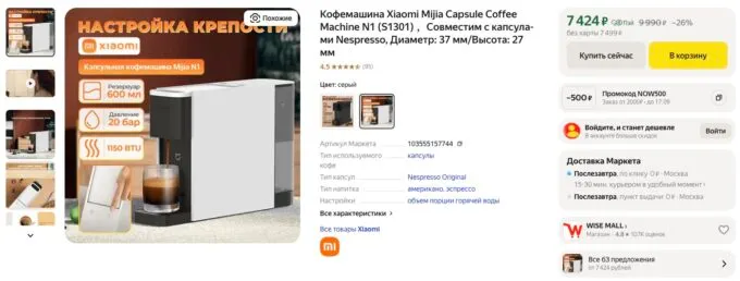 Сейчас шикарную кофемашину Xiaomi Capsule Coffee Machine N1 можно купить на Яндекс Маркете всего за 7424 рубля. Также не забывайте, что с кэшбеками некоторых банков она обойдётся ещё дешевле.