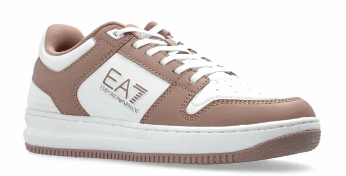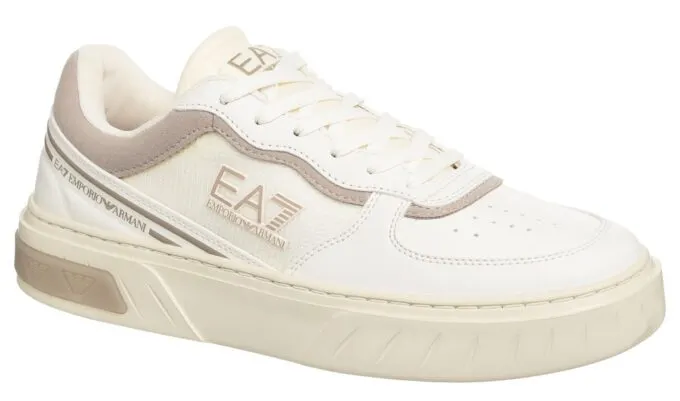 Завершаем подборку с помощью бежевых кроссовок с амортизирующей межподошвой и верхом из прочной искусственной кожи. Здесь стоит обратить внимание на дизайн: верх обуви украшен волнообразными линиями и логотипами EA7, а фишкой айтема становится толстая резиновая подошва.