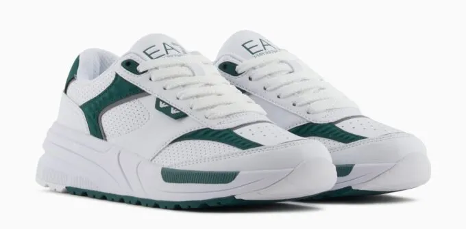 Начнем с белых кроссовок от Emporio Armani. Это обувь с брутальным дизайном, массивной подошвой и укрепленным мыском. Но главная фишка айтема – воздухопроницаемость. Кроссовки оснащены топовой системой перформации, поэтому ваши ноги, уж поверьте, не перестанут дышать. Отдельно отметим дизайн: тут вам и цепкий протектор, и логотип EA7 на язычке.