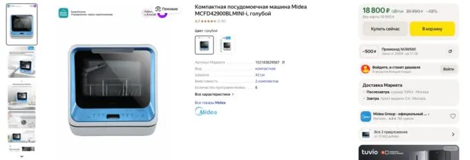 Сейчас на Яндекс Маркете компактную посудомоечную машину Midea MCFD42900GMINI-i можно урвать всего за 18 800 рублей. Также не забывайте, что многие банки предлагают кэшбек за покупки на этой платформе.