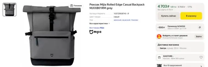 Прямо сейчас свежий рюкзак Xiaomi Mijia Rolled Casual Backpack можно забрать на Яндекс Маркете всего за 4703 рубля. Также не забывайте, что многие банки готовы отсыпать щедрый кэшбек за покупку на этой платформе.