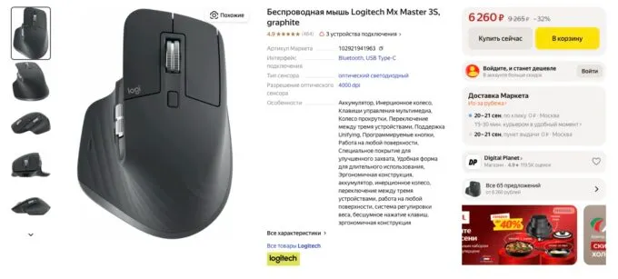Обычно за Logitech MX Master 3S просят около 10 тысяч, но сейчас на Яндекс Маркете лучший аксессуар для MacBook можно урвать всего за 6260 рублей.
