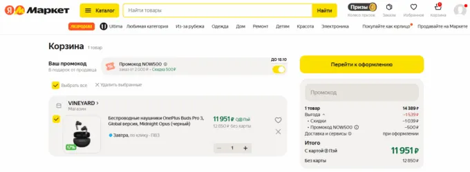 Что по прайсу? Сейчас OnePlus Buds Pro 3 висят на Яндекс.Маркете всего от 12 850 рублей по промокоду NOW500. Стоит отметить, что цена указана для Москвы — жителям других городов нужно переключиться на столицу и проверить, можно ли оформить доставку.
