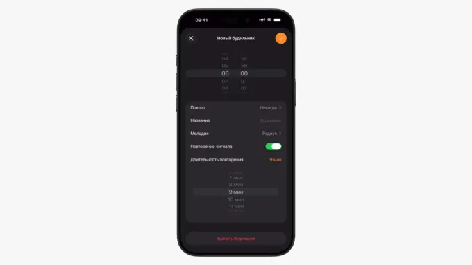Новая фишка будильника — можно настраивать длительность повторения сигнала. Не стандартные 9 минут, а от 1 до 15 минут.